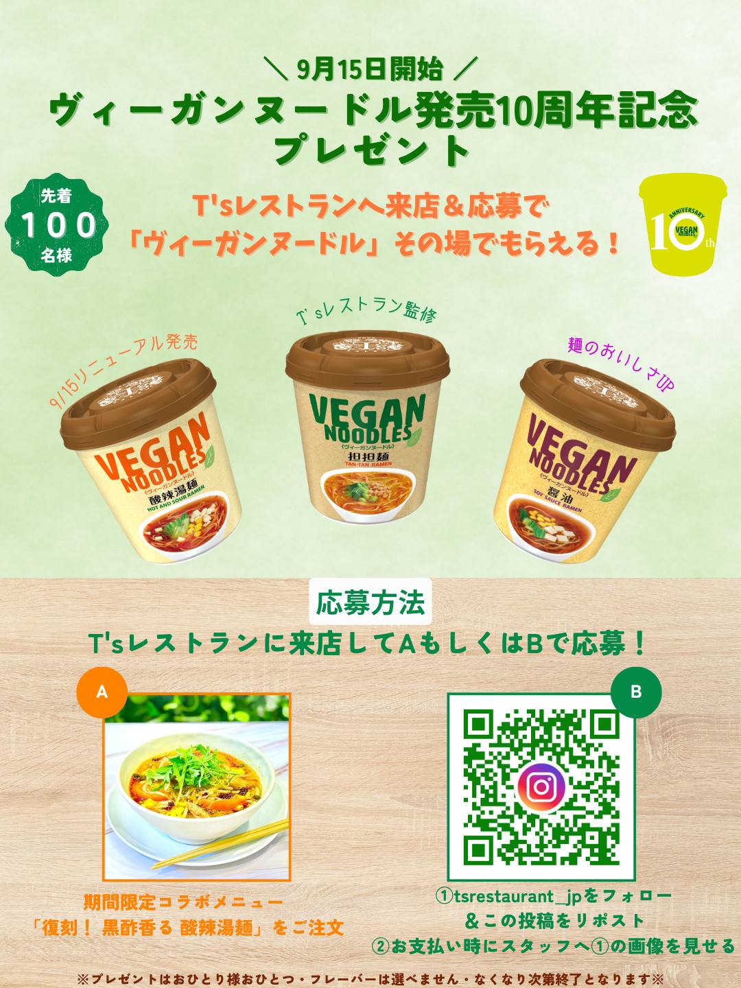 T’s レストランへご来店&ご応募してくださった先着100 名様にヴィーガンヌードルをおひとつプレゼント🎁✨