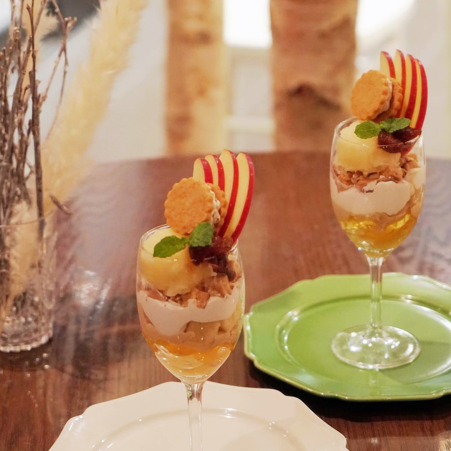 生りんご/キャラメルりんご/レーズンサンド/りんごソルベ/クルミ/米粉クッキー/豆乳ホイップクリーム/米粉スポンジ/キャラメルアイス/りんごゼリー/煮りんご