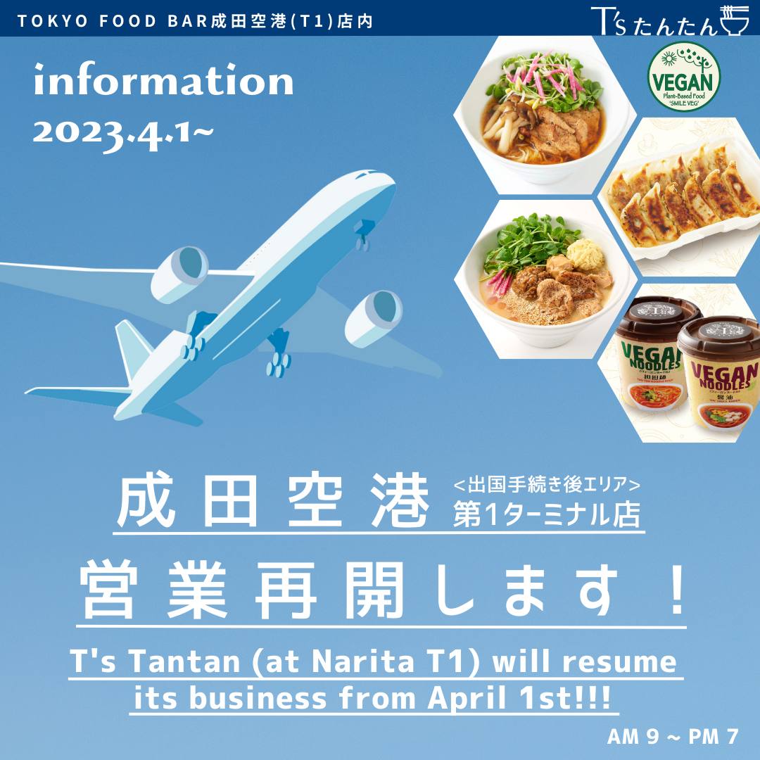 T’s たんたん「成田空港第1ターミナル店」4/1より営業再開のお知らせ!